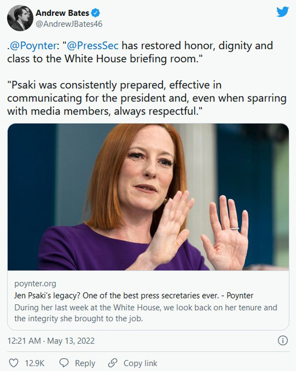 “Psaki has restored honor, dignity and class to the White House briefing room after four years of Donald Trump press secretaries, who seemed more interested in picking fights and criticizing the media than effectively communicating that administration’s policies and agenda,” Poynter’s Tom Jones