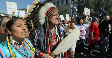 San Francisco’s school system has decided the word “chief” is racist, and therefore no longer may be used in job titles. Pictured: Chief Phil Lane of the Yankton Dakota and Chickasaw First Nations marches with demonstrators to City Hall during a rally against climate change Feb. 17, 2013, in Los Angeles. (Photo: David McNew/Getty Images