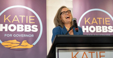 “Hobbs, acting in her official capacity, using state resources, and at times in coordination with the Biden administration, asked Twitter to remove posts on her behalf,” Arizona’s Republican Party chairwoman argues. Pictured: Arizona Gov.-elect Katie Hobbs speaks Nov. 5 during a victory rally at Luna Culture Lab in Phoenix. (Photo: Rebecca Noble/The Washington Post/Getty Images)