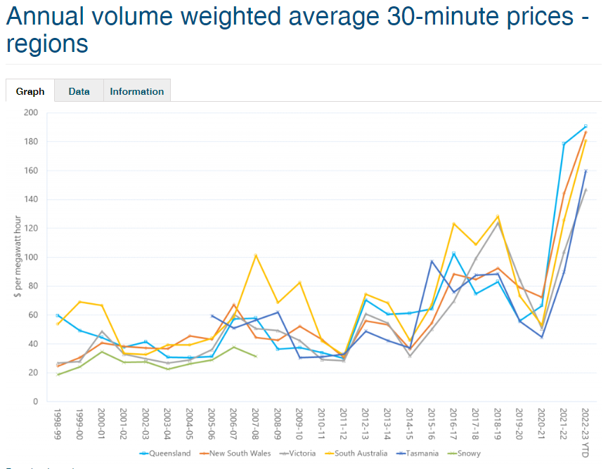 Following the closure of another coal-fired power plant, Australians have just been told their power bills will jump by 25 to 30% come July. That colossal hike follows annual, double-digit increases every year, for the best part of a decade (see above).