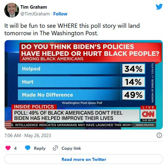 A new Washington Post-Ipsos poll of 1,200 “non-Hispanic Black adults” asked whether President Biden’s policies helped, hurt, or made no difference to black people. Almost half — 49 percent — picked “made no difference.” Ouch. When they displayed this poll result on CNN’s Inside Politics on Thursday, I had to joke on Twitter that this poll would probably be buried inside the paper:
