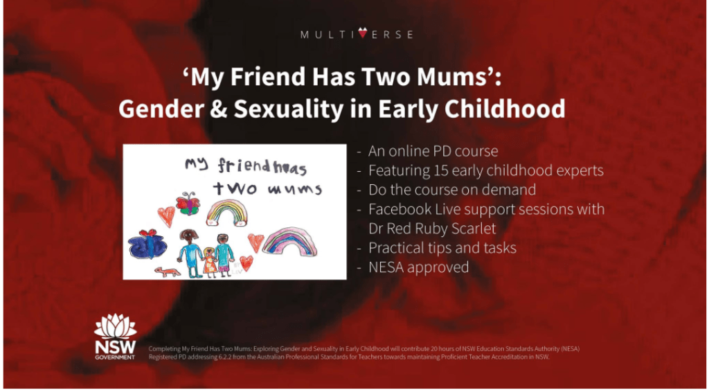 The content videos will consist of interviews between Dr Red Ruby Scarlet and those listed below:Module 1. Queer Thinking in Early Childhood – Professor Kerry H Robinson Module 2. The National Quality Framework – Nicholas Stewart Module 3. Putting Inclusive Policies in Place – Anthony Semann Module 4. Using Anti-Bias Approaches – Jill Huntley Module 5. A Transgender Early Childhood Educator – Sharon Priestley Module 6. Heterosexuality as an Identity – Michael McGirr Module 7. Transitioning as Parents – Teighan & Tammie Cosier Module 8. Queer Pedagogies – Stephen Gallen Module 9. Intersex Identities – Dr Agli Zavros-Orr Module 10. Living Non-Binary – Danny Xanadu Module 11. Leadership and Life – Sarah Louise & Ace Dean Module 12. Aboriginal Queerness and Queeness – Nana Miss Koori/Graham Simms Module 13. Rainbow Families – Ashley Scott and Cathy Brown’ https://multiverse.com.au/my-friend-has-two-mums/