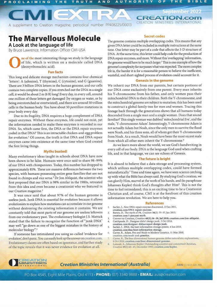 Posted in: Science. Tagged: Bible, Biologists, Biology, Christianity, Creation Magazine, Creation Ministries International, Creation Science, Creation Scientists, Creation/Evolution, Faith, Higher Education, Iowa, Life, Lord Jesus Christ/Grace/Salvation, Molecule, News, pdf, religion, Science, True/False, True/Information, truth. Leave a comment